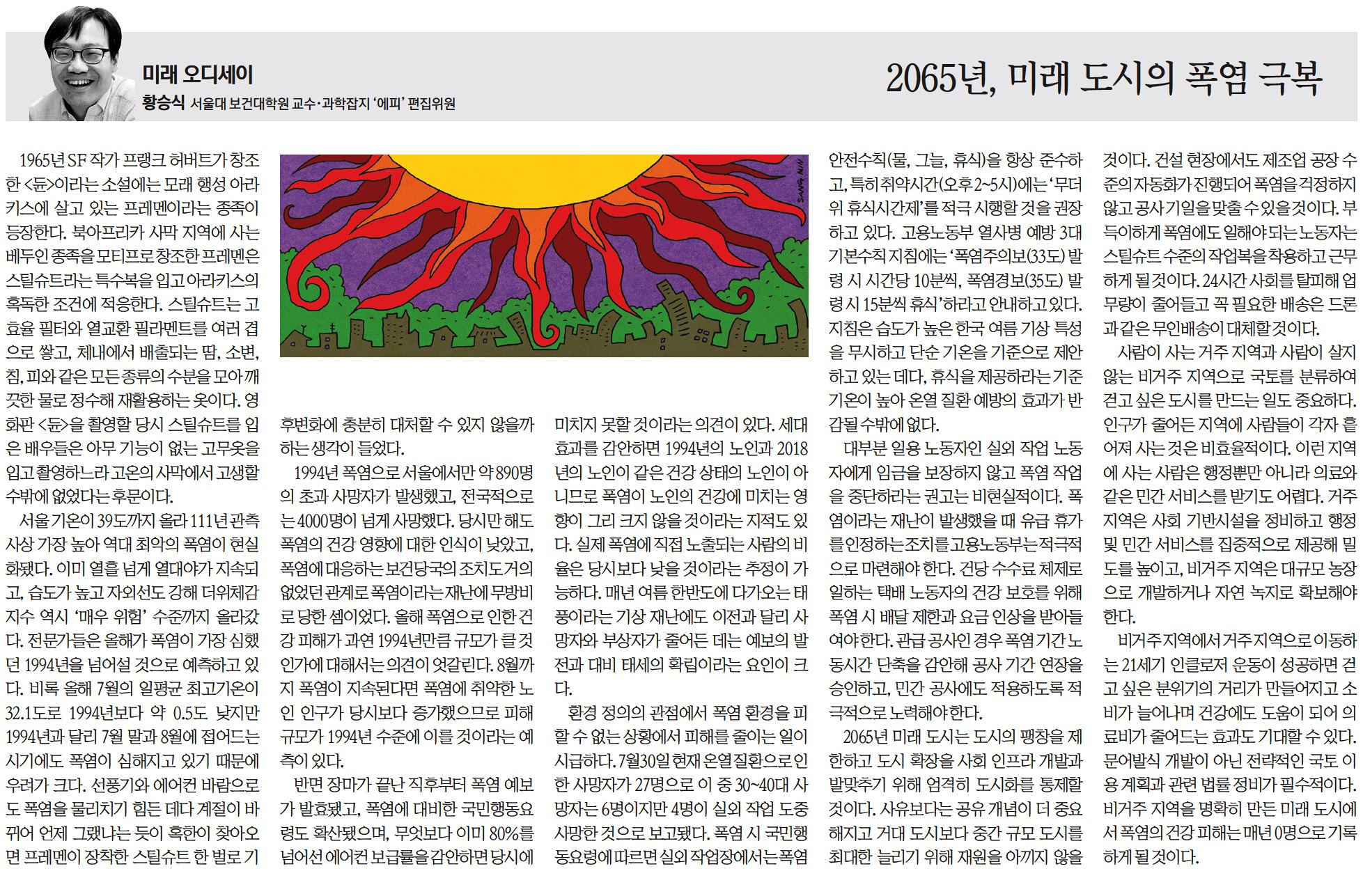 중얼 연습 2025. 6. 16. 16:18 |2018년 8월 1일 자 경향신문 [미래 오디세이]에는 '2065년, 미래 도시의 폭염 극복'이라는 제목으로 칼럼을 써보냈다. 소설 <듄>에 나오는 프레멘 족의 복장으로 도입부를 시작했는데 드니 빌뇌브 감독의 영화 <듄> 시리즈가 개봉하기 한참 전이라 별 반응이 없었던 기억이 난다.