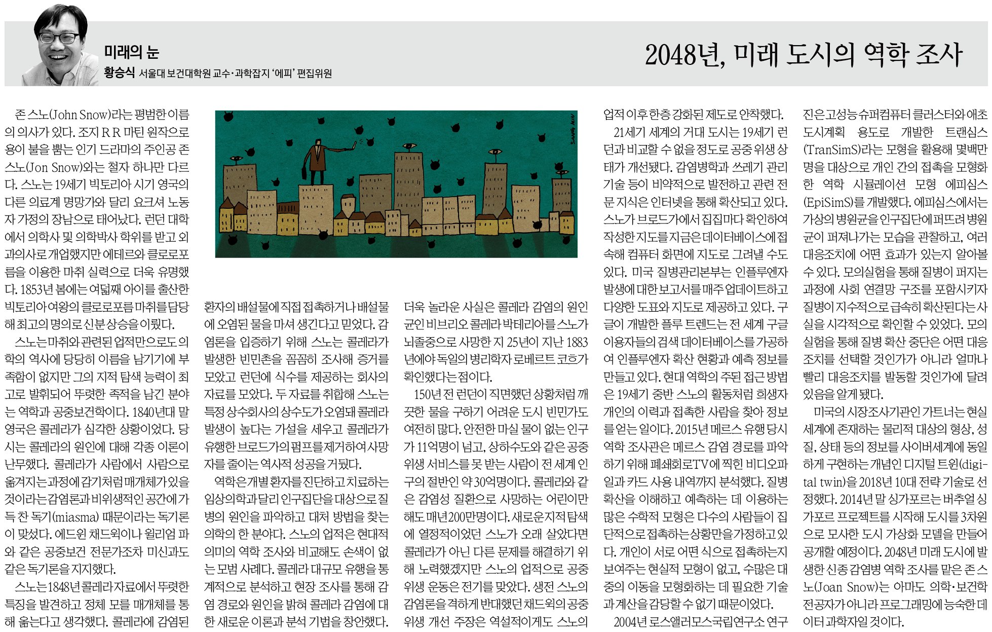 미국의 시장조사기관인 가트너는 현실 세계에 존재하는 물리적 대상의 형상, 성질, 상태 등의 정보를 사이버세계에 동일하게 구현하는 개념인 디지털 트윈(digital twin)을 2018년 10대 전략 기술로 선정했다. 2014년 말 싱가포르는 버추얼 싱가포르 프로젝트를 시작해 도시를 3차원으로 모사한 도시 가상화 모델을 만들어 공개할 예정이다. 2048년 미래 도시에 발생한 신종 감염병 역학 조사를 맡은 조앤 스노(Joan Snow)는 아마도 의학·보건학 전공자가 아니라 프로그래밍에 능숙한 데이터 과학자일 것이다.